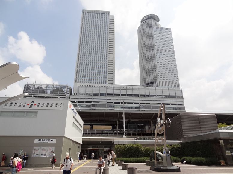 名古屋駅の西側から見た名古屋駅です。新幹線のホームと東にそびえるビル(左:JRセントラルタワーと右:名古屋マリオットアソシアホテル)が見えています。