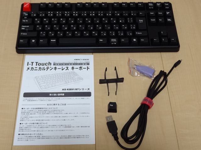 付属品として説明書、接続ケーブル、PS2アダプタ、キートップ交換用ツールそして”ESC”キートップ。