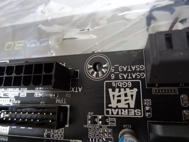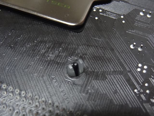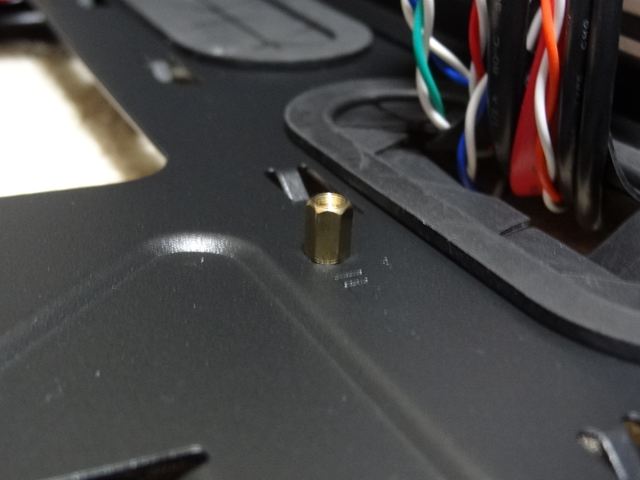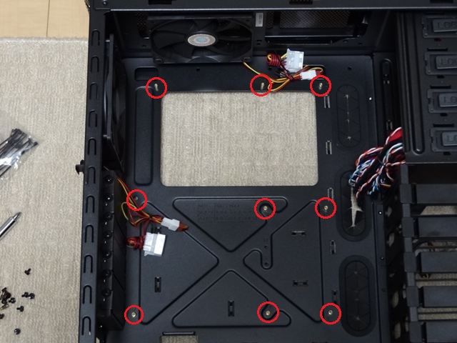 この穴と一致するケースの穴にスタンドオフを立てて行きます。このスタッドにスクリューでマザーボードを固定していきます。