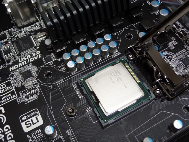 ではCPUをマザーボードに取り付けます。まずマザーボードのCPUソケットの脇にあるレバーを起こします。
