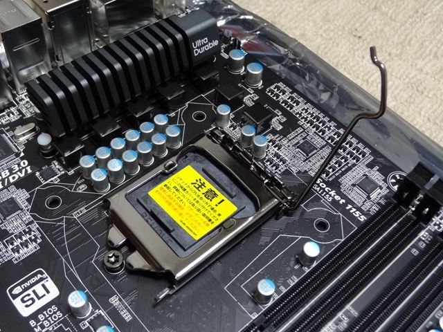 次に注意と書かれたカバーを取り除き、そこにCPUをセットします。その時はCPUの切り欠きとソケットのボッチを合わせてそっと置きます。