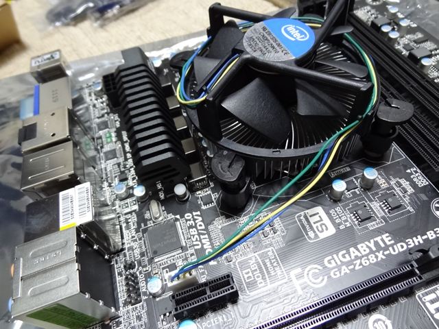 これがCPUファンです。通常の使用ではこれでも十分かと思いますがOC(Over Clock)するような場合にはもっと強力なファンに取り替えます。私としては将来的に水冷を考えています。