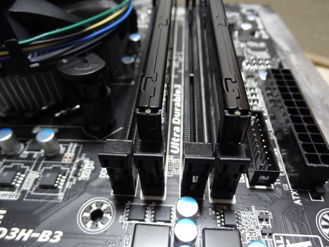 メモリの取り付けはメモリの切り欠きとソケットのボッチを合わせて上からガツンと押し込めばOKです。その時ソケット両端のレバーが元の位置に戻っていることを確認します。