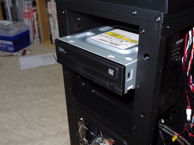 DVDドライブはケースの5インチベイに取り付けます。一番上はBluray Drive用に空けておきますので、上から2番目に取り付けます。これもネジは使用せずにワンタッチで取り付けられます。今までは前後左右計4本のネジで固定していたので、これは簡単でいいですね。