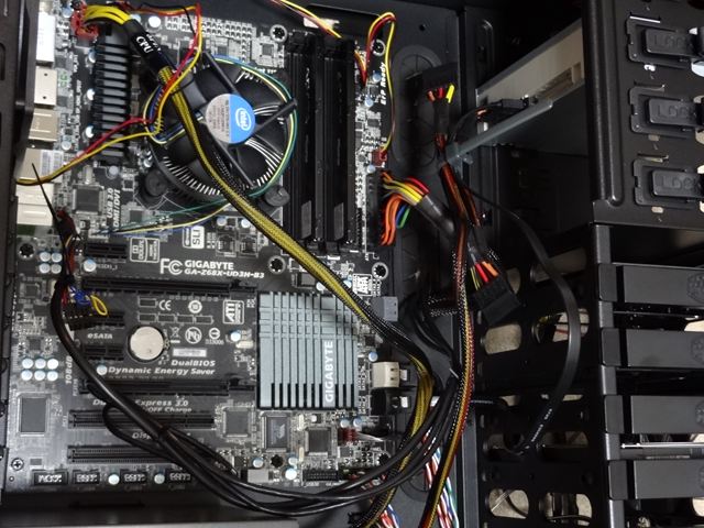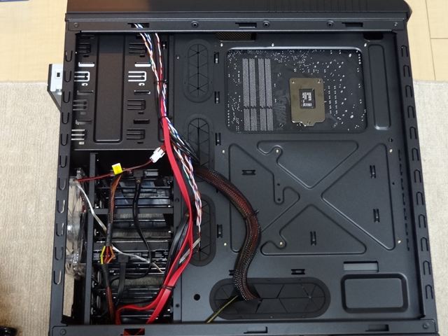 結構ごちゃごちゃしてますね。マザーボード上のATX_12V_2X4に接続するケーブルの長さが裏側を回すには短くて写真で見えてますが電源からCPUの上を越えてコネクタにいってます。
