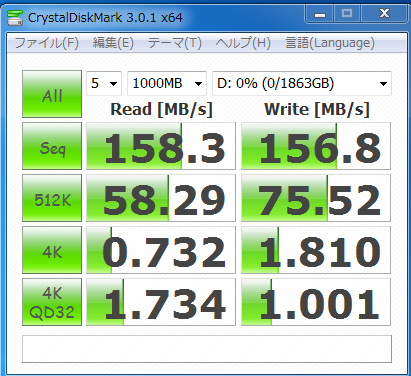 日立HGSTの0S03191はSequencial Readで158.3MB.S、Sequencial Writeで156.8MB/S。 当初購入を予定していたWD Caviar Green 2TBは125.4MB/Sと123.9MB/S。書き込み/読み込みとも少々速いですね。さすが7200rpm!