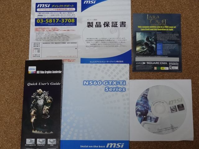 説明書とドライバインストール用のCDです。あと特典として右上にありますがEIDOSのGAME「Lara Croft and The GUARDIAN OF LIGHT」のダウンロードキーが書かれたカードが添付されています。これは楽しみです。