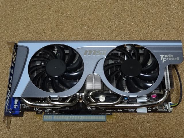 これが本体です。MSIオリジナルのTwin FanであるTwin FrozrⅡが特徴です。これは冷却能力には定評があります。GTX560 TiはミドルクラスのグラボではRADEONのHD6950と張り合っているゲーマーに人気のグラボです。本機はコア/メモリクロックともに大幅にOC(Over Clock)した製品です。コアクロックは822MHZから880MHZにUpしています。