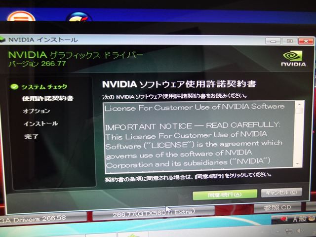 では電源を入れてPCを起動しNVIDIAのドライバをインストールします。NVIDIAのサイトから最新版をダウンロードする手もありますが、一旦はCD-ROMから入れることにしましょう。