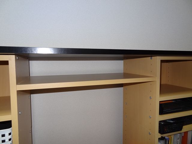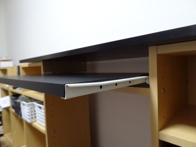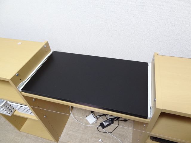 思ったよりは簡単でした。ポイントはテーブルを取り付ける幅からレールの厚み左右12.5mmと木口テープの厚み1mmを差し引いた長さ(ここでは537mm)に板をカットするところでしょうか。レールが白いのがちょっといただけませんがこれしか無いんですよ。機能的は大満足です。