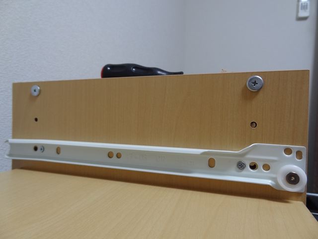テーブル板の両サイドに引き出し側のレールを取り付けます。