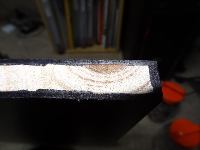 まずお店でカットしてもらった化粧板の木口にテープを貼ります。その前にテープの隙間から木肌が見えないように黒マジックで端っこを黒く塗っておきます。