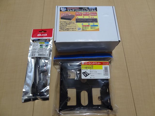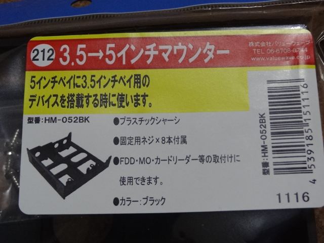 それからこのリーダーは3.5inchサイズですので5inchベイに取り付けるために3.5→5インチマウントを準備しました。PCケースにもアダプタが付属していましたが、デザインが今ひとつなので。