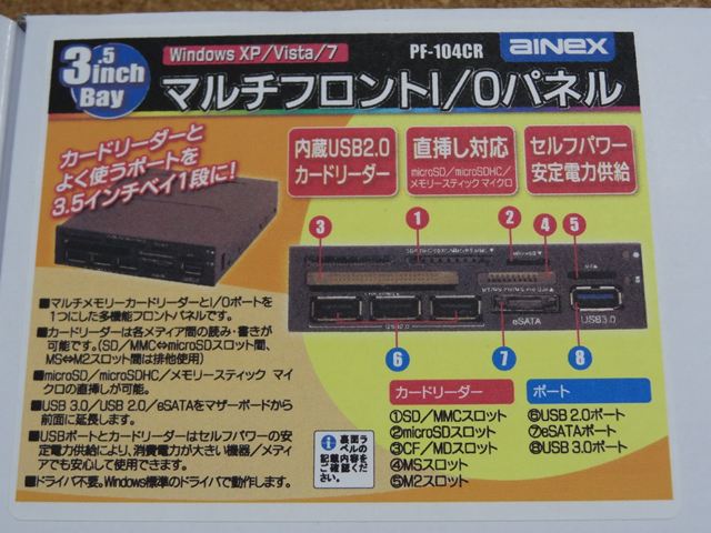 まずメインとなるカードリーダーです。アイネックスのPF-104CR マルチフロントI/Oパネルです。