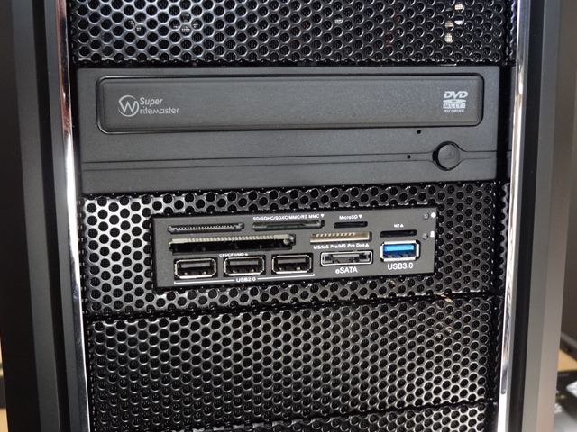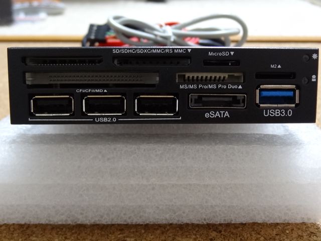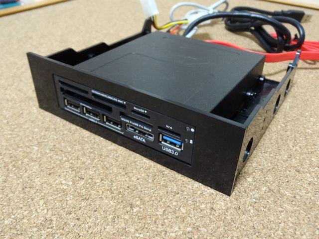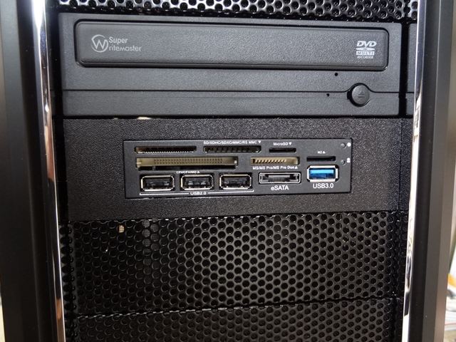 以上で取り付け、配線終了です。USB2.0にUSBメモリを挿して、問題なく読めることを確認、続いてカードリーダーにSDHCカードを挿して確認しました。eSATAは外付けHDDがeSATAインターフェースを持っていますので、これを接続して確認しました。USB3.0は対応機器を持っていませんので昨日は未確認です。