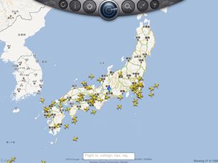 世界中を航行している航空機が表示されます。これは日本を拡大表示して見たところです。航空機のシンボルはリアルタイムで移動していきます。
