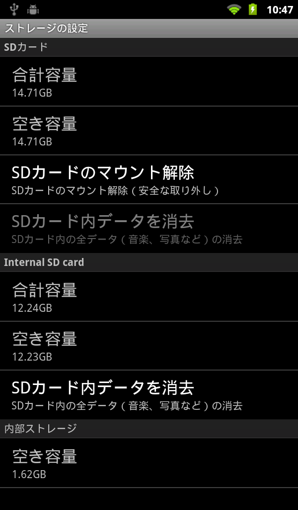 上からSDカードとあるところがMicro SDカードになります。Internal SDカードに16GBのうち14GBが、内部ストレージに2GBが割り当てられています。