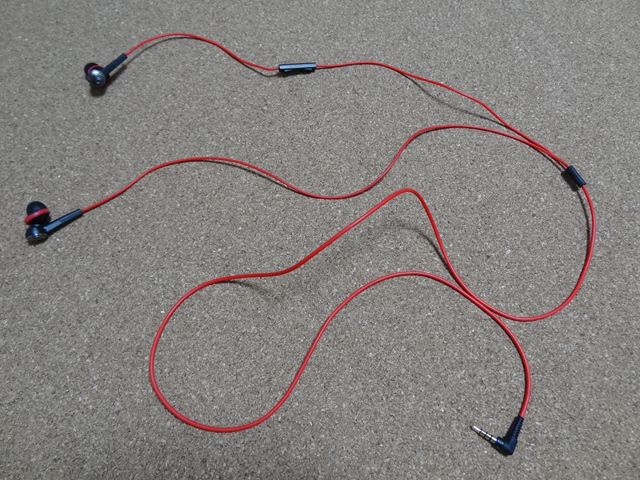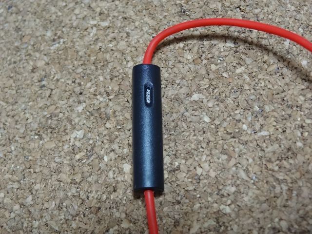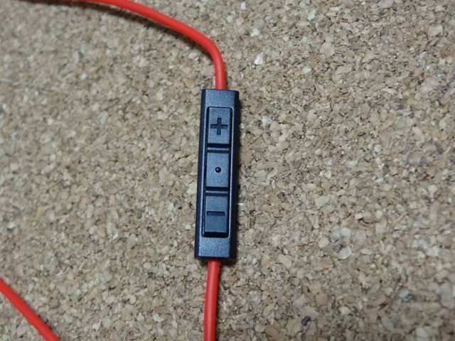 (+)、(-)はボリュームボタンで、中央はコントロールボタンになります。コントロールボタンは1回押しで一時停止/通話終了に2回押し、3回押しで曲の移動や頭出しを行います。