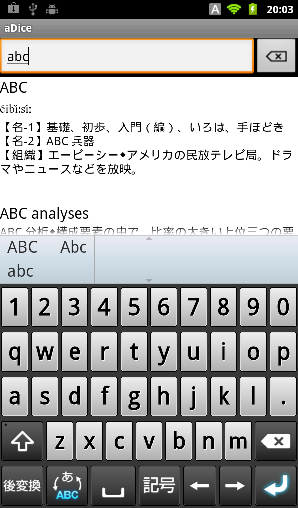 「adice」を起動し検索する画面です。入力はATOK Android(Passport版)になっています。
