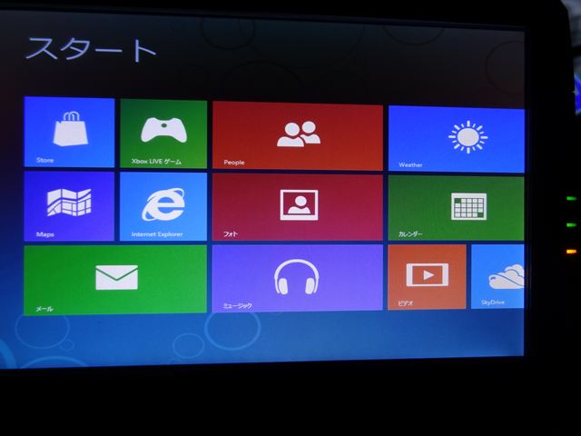 これがWindows 8のスタート画面です。「メトロ」と呼ばれるUI(ユーザーインターフェース)でXbox360やWindows Phone7なんかと統一したデザインとなっています。