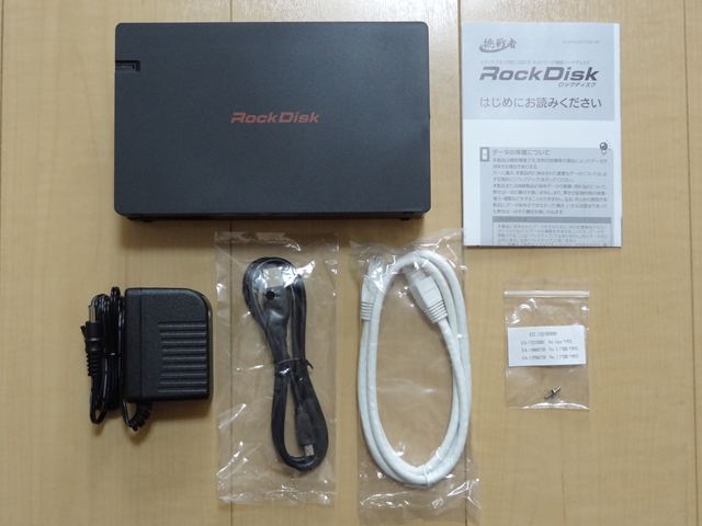 本体、電源アダプタ、USBケーブル(黒)、LANケーブル(白)、簡単な説明書、ネジ(何に使うか不明)