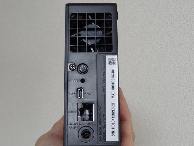 こちらが背面。背面にはファンの下に電源スイッチ、RESETスイッチ、USBポート(LAN接続で無くUSB接続HDDとしても使用可)、LANポート、電源用DCジャックがあります。