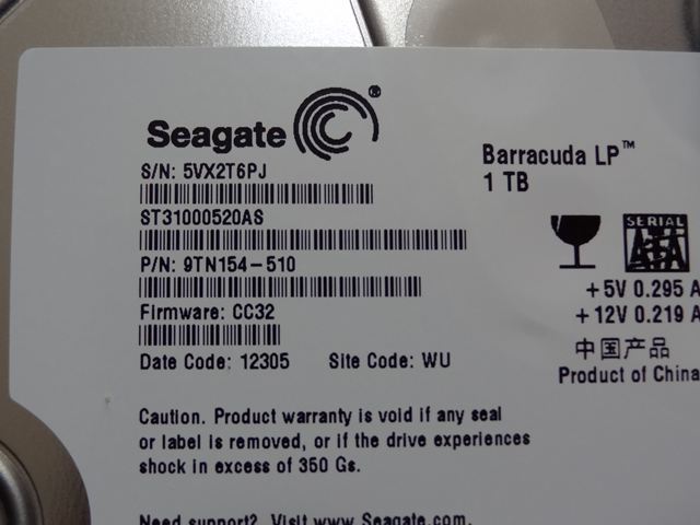 内蔵されていたのはSEAGATE製 Barracuda LP 1TB 型番 ST31000520ASのHDDでした。