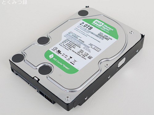 ハードディスクはWD Caviar Green WD20EARX 2TB。昨年のタイ洪水以降ハードディスクの高騰が続いており、最近になってようやく下がってきましたが以前のような価格には戻っていません。その中で1万円を切っているWDの2TBはお買い得のように思います。