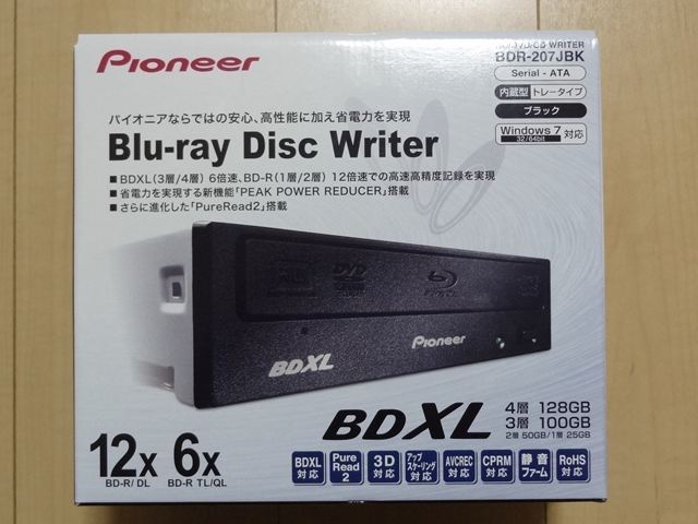 これがBDR-207JBKです。一番の特徴はBDXL対応になったことなので箱にも大きな文字で書かれています。