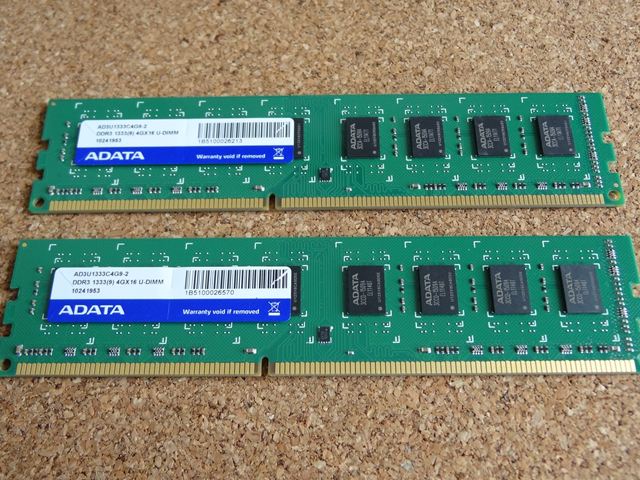 ここにADATAのAD3U1333C4G9-2 4GBを2枚取り付けます。