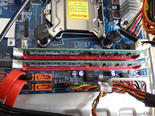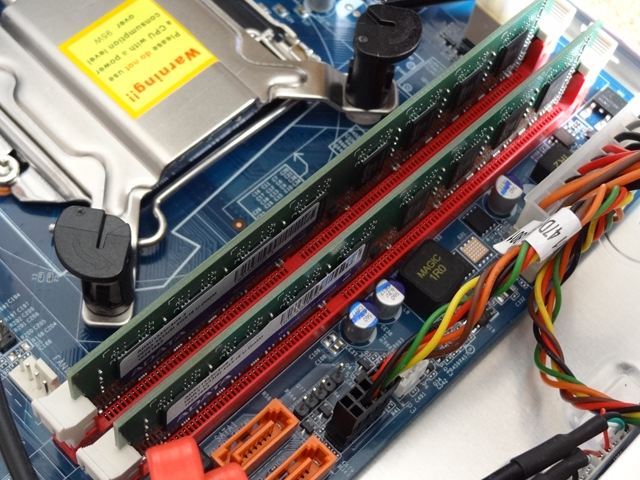メモリソケットの両端にあるレバーを倒して、メモリの切り欠きとソケットのそれと併せて上から押して両端のレバーがカッチっと起き上がるまで押し込みます。