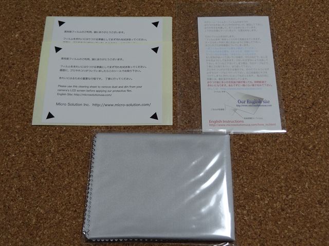 液晶保護シートが2枚と埃を取る為のシールが2枚。それにマイクロファイバークロスが付属しています。
