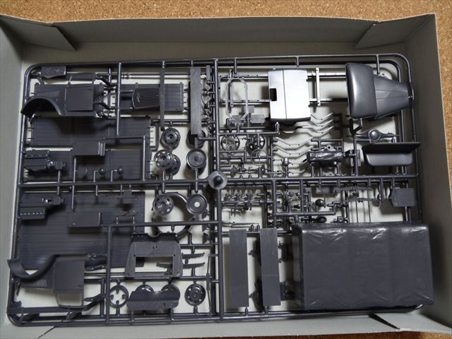 このキットの最大の問題点はタイヤの素材です。この素材はプラスチックを溶かしてしまうのです。自宅に買い置きが2個ありますが、この前、箱を空けたら見事にタイヤに接触していた部分のプラが溶けていました。それで写真にあるようにビニールの袋に入れてあります。