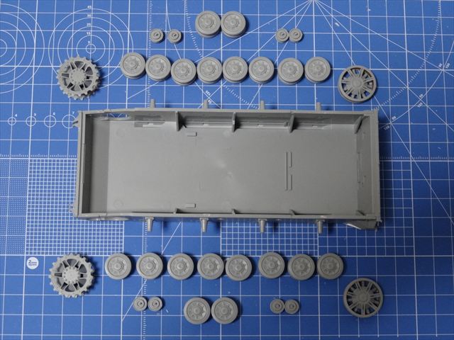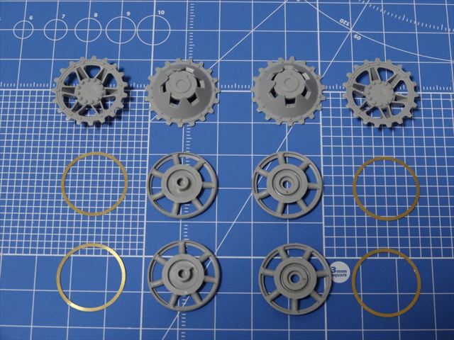 まず起動輪と誘導輪を組み立てます。上部が起動輪で下部が誘導輪になります、誘導輪の横にあるのがエッチングのリングパーツです。