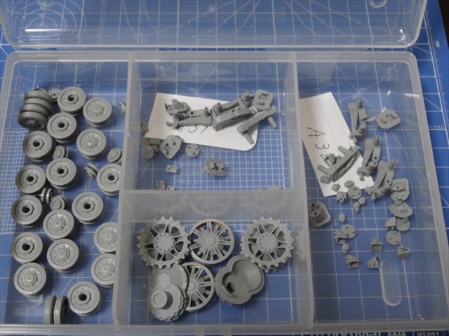 足回りの部品をすべて切り出しました。結構な部品点数ですべてのバリを処理するのは大変でした。左右で異なる部品はそれぞれ分けて保管しておきます。