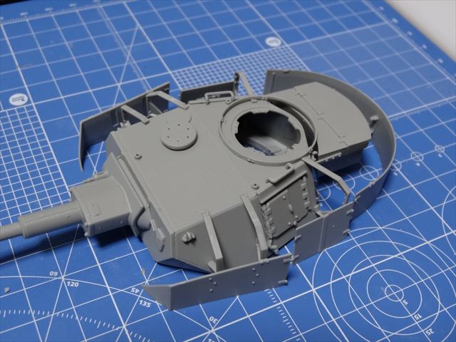 砲塔の周囲にシュルツェン(追加装甲)を取り付けて砲塔を完成させます。