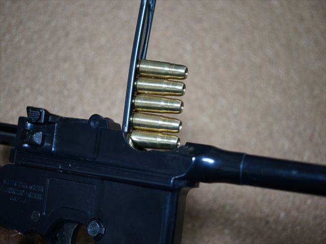 通常マガジンを外してカートリッジを装填しますがモーゼルM712は専用のクリップを使って上部から装填することが可能です。カートリッジを上から押し込むと一気に装填されます。これが爽快なんです。