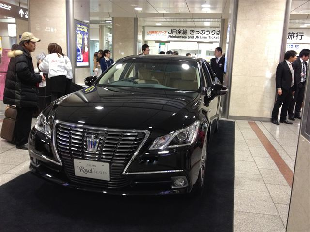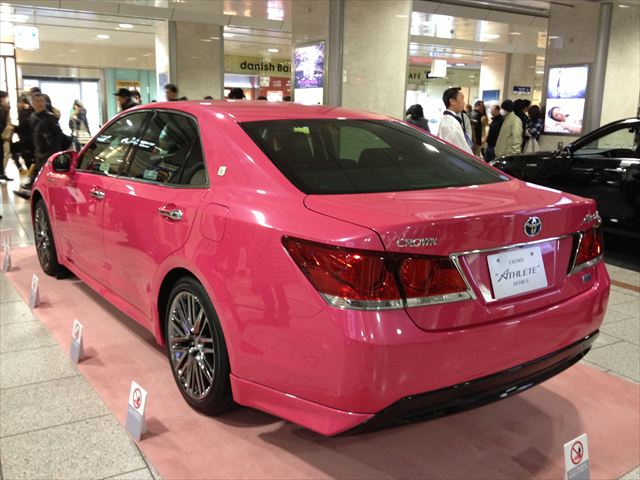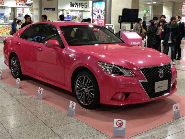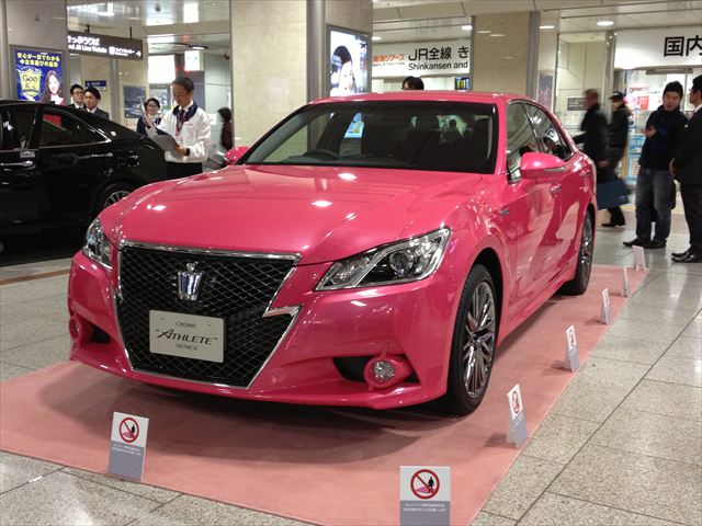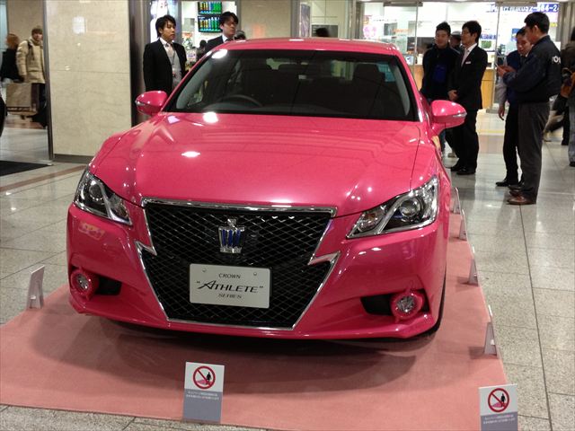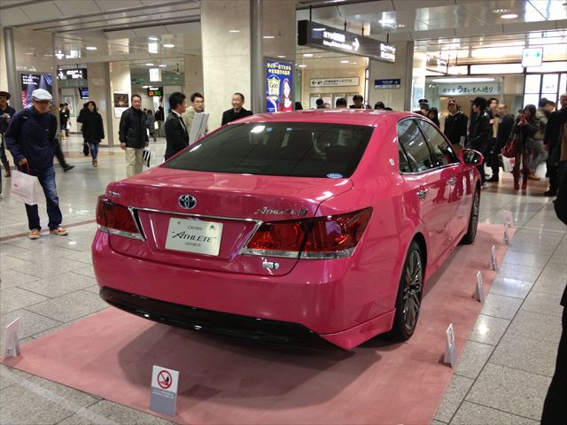 名古屋駅のコンコースにトヨタの新型クラウンが展示されていました。TVのCMでもピンクの外観が衝撃的な新型クラウンアスリートです。実際のピンクはやや落ち着いた色でした。どちらかと言えば保守的なイメージのトヨタにしては驚きです。