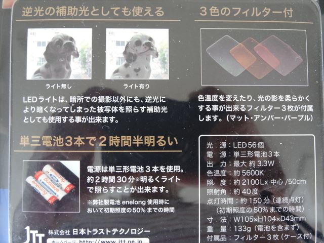 3色のフィルターが同梱されています。単三乾電池3本を使用し2時間半店頭することが出来ると書いてあります。