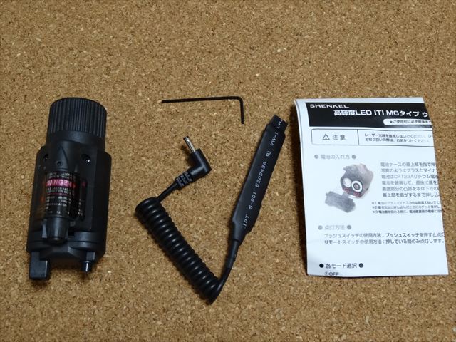 本体、カールコードのついたリモートスイッチ、サイト調整用6角レンチ、日本語の取扱説明書になります。