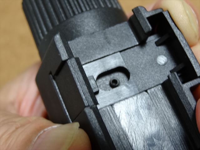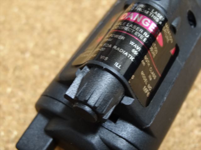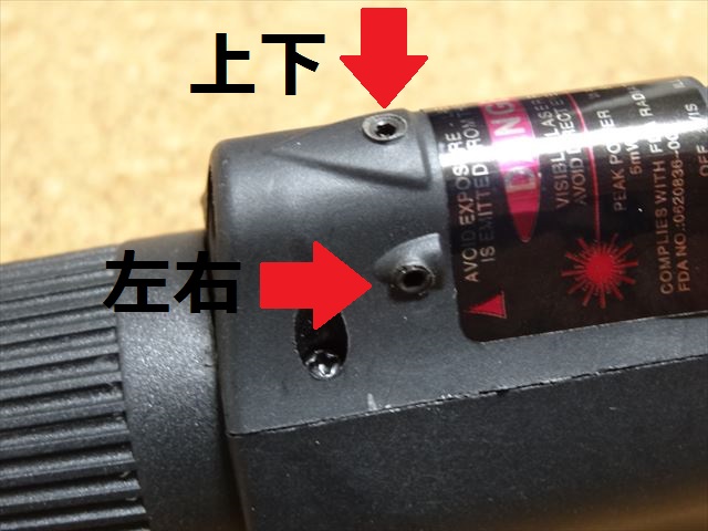 レーザーサイトの調整用6角ネジです。それぞれ上下および左右に調整することが出来ます。射撃する距離に応じて調整しないとズレが生じますので注意。