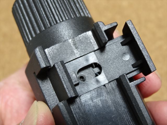 メカのボタン部を押して銃器のレイルにはめ込みます。