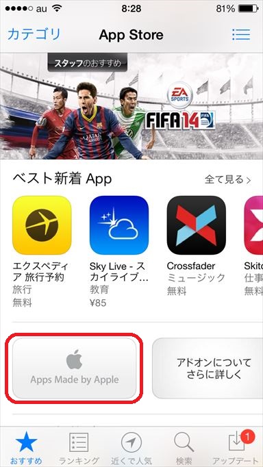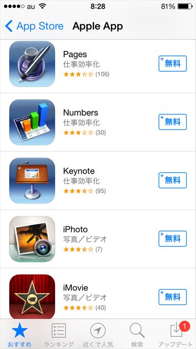 そこでApp Storeを開き「おすすめ」の中を探していると「Apps Made by Apple」が目にとまりました。そこをタップすると出ました出ましたPages、Numbers、Keynote、iPhoto、iMovieが無料の表示。