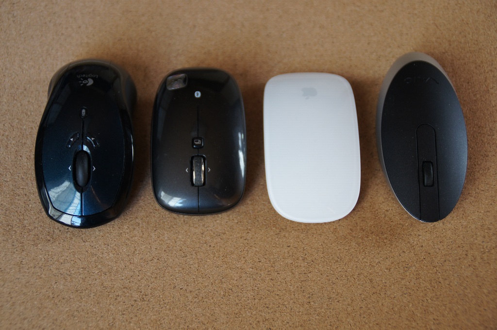 左からLogicool(Logitech) LX7 Cordless Mouse、Logicool Bluetooth Mouse M555b、Apple Magic Mouse、SONY Bluetooth Mouse VGP-BMP33/B