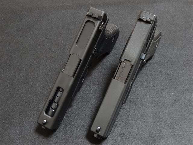 左が東京マルイのG18Cです。G17にはコンペンセーターの大きな穴がありません。