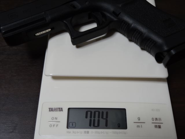 重量はマガジン込みで704gです。MGCのG17は540gですからまぁまぁの重さですね。