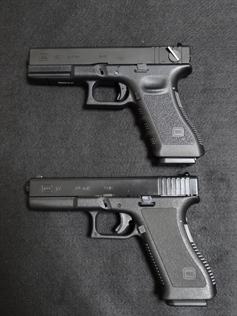 参考にMGCのG17と並べてみました。上が東京マルイのG18Cです。G18Cにはグリップにサムレストがあります。