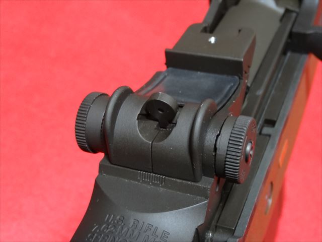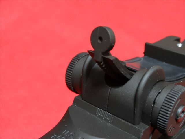 リアサイトは左側面のダイアルを回すと上下に動き、距離の調整が出来ます。反対側のダイアルは左右の調整になります。