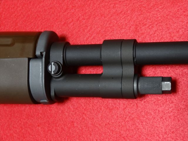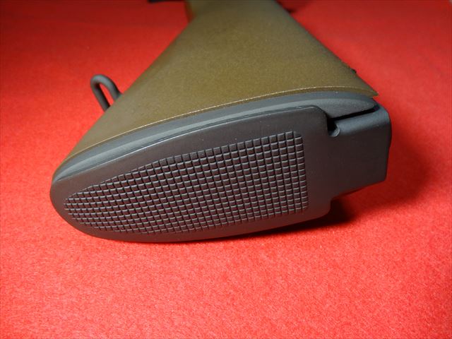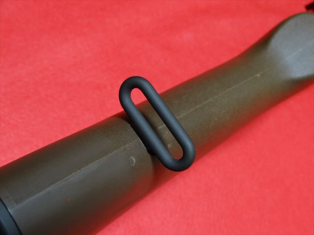 ストックは樹脂製ですがこちらもしっかりした造りになっています。しかし木製ストックに交換したいですね。前方にはスリングスイベルがスクリューでなく鋲で固定されています。