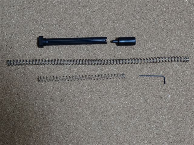 こちらが付属品。上段がBB弾のローダー、次が柔らかめのリコイルスプリング、30発装填用のマガジンスプリング。これらは説明書も何もないので真実かどうかは不明です。また交換方法も自分でネットを使って探さなくてはなりません。